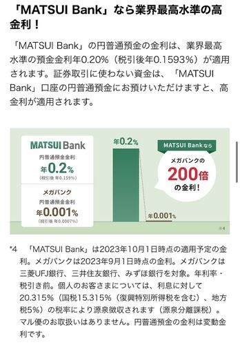 いやはや、吉報です。 www.netbk.co.jp 10/1からMATSUI Bank登場‼️円普通預金金利年0.20%‼️あおぞら銀行BANK支店やauじぶん銀行と同水準‼️おそらく条件とかないと思われ。しかも月5回までATM・振込が無料‼️他のNEOBANKアプリのUIが素晴らしいので是非とも口…