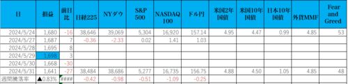 わたしのメイン証券口座アカウントたるSBI証券での運用成果について週次で振り返ってみます。 ■元本:3000万円→4641万円 ■トータルリターン:1680万円→1641万円(▲0.83%) ■日経225:38646→38484(▲0.42%) ■NYダウ:39069→38686(▲0.98%) ■S&P500:5304→5…