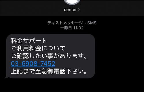 centerを名乗るやつからのSMSです。 内容は 料金サポート ご利用料金について ご確認したい事があります。 03-6908-7452 上記まで至急御電話下さい。 とありました。 一体全体、何の料金サポートなのでしょうか。 電話を煽るなんてとんでもない輩ですね。 せ…