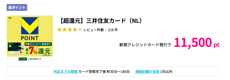 ポイントサイトハピタス経由で年会費無料の三井住友カードNLを新規発行すると11500円相当ポイントがもらえます。