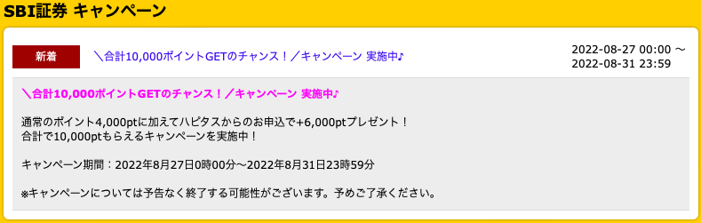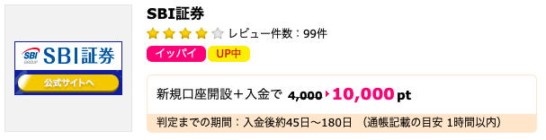 大手ポイントサイトハピタス経由でSBI証券に口座開設して5万円を「入金」するだけで1万円相当のポイント(振込手数料無料で現金化も可能♬)がもらえます。